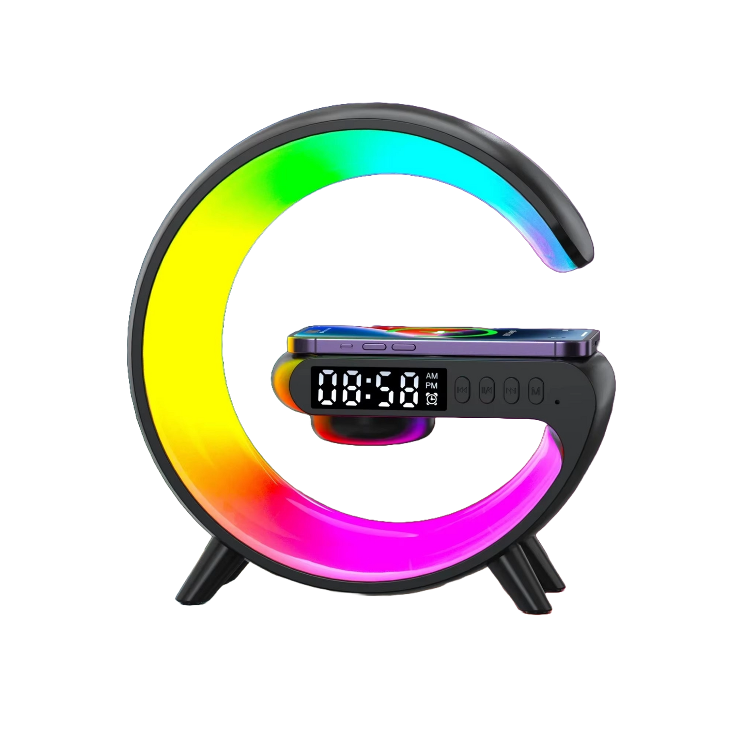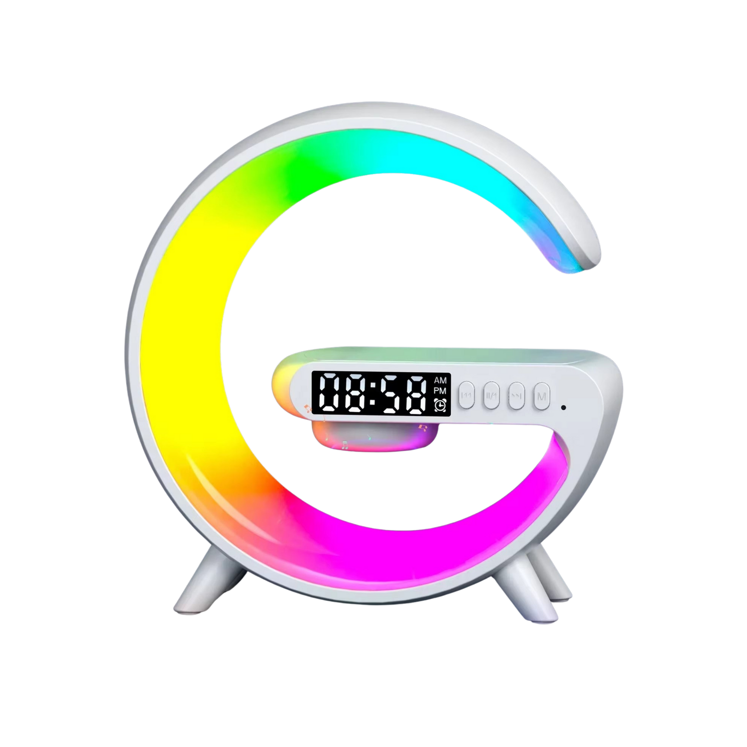 Libera espacio en tu mesita de noche con G-Lamp: 4-en-1. Carga inalámbrica rápida de hasta 15W, altavoz Bluetooth, lámpara ambiental RGB y reloj despertador en un solo dispositivo compacto y moderno. Ideal para cualquier smartphone compatible.